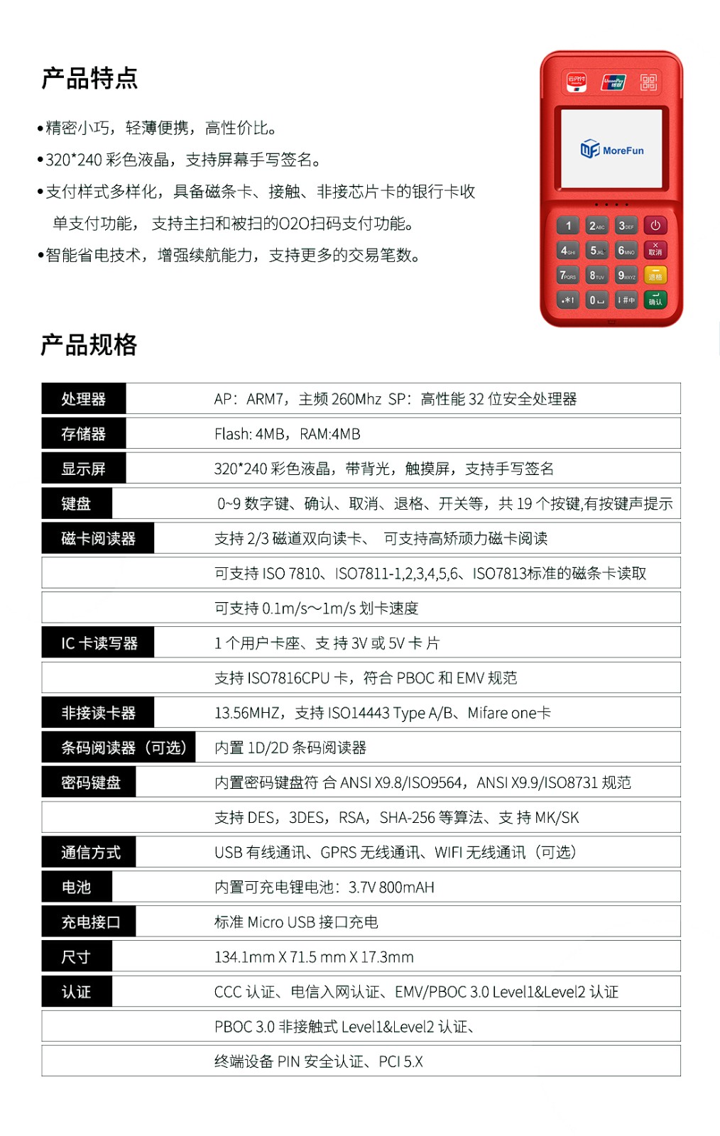 首页>>长安产品中心>>长安手持无线POS 长安电银支付-4G+扫码枪 高配版 * 性能优越:32位高性能ARM11安全CPU;整机通过业内更先进的PCI PED4.X 安全认证及国内受理终端PIN输入设备安全评估检测认证,多项措施保障金融交易的安全;* 时尚外观:外形小巧携带方便,高抗跌落性能、宽工作温度、防水防尘设计、外壳坚固耐刮、户外携带式作业更加耐久可靠。* 通讯备份:支持2G-3G扩展;* 超长续航:3.7V-800毫安稳定续航能力,智能电池管理保证持续工作18小时,待机72小时。 标准配置 返 回